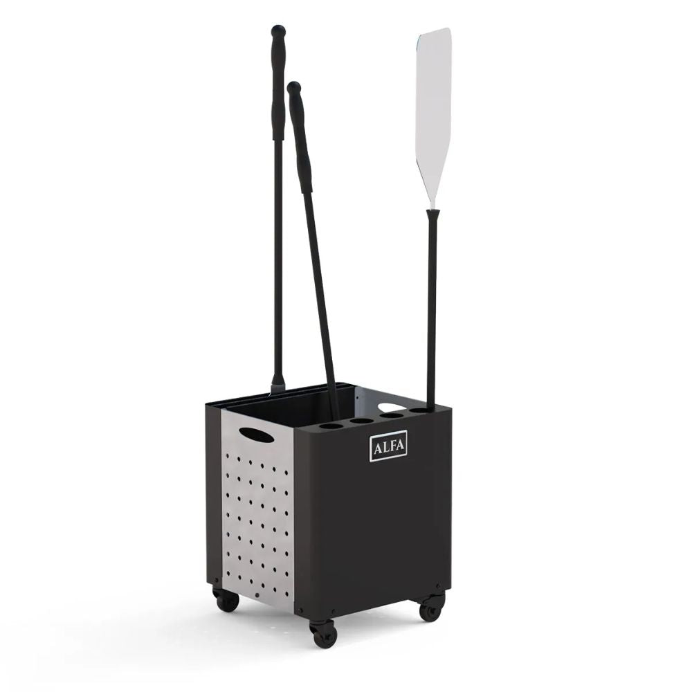 Decorated in two colours, in line with the other Alfa accessories, it is a precious contribution to furnishing your garden and at the same time a useful tool for the pizza chef to store the pizza peels, to hold the wood or to insert a waste basket.