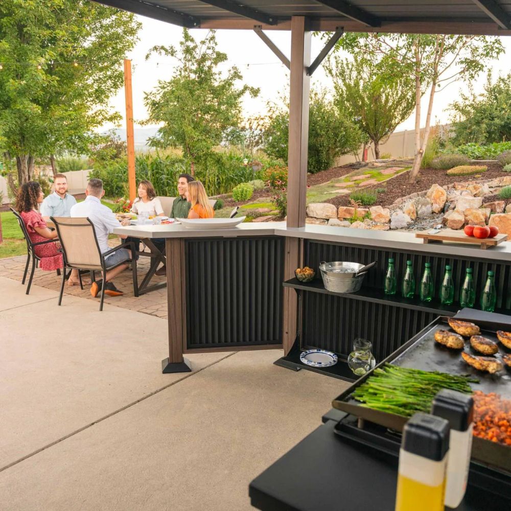Upgrade your outdoor cooking and entertaining with the Blackstone 10 x 10-Foot Bar and Griddle/Grill Pavilion. This spacious pavilion provides a robust shelter with durable galvanized steel and aluminum construction, perfect for housing your griddle or grill. Its design includes a large serving area and reversible bar, making it the focal point for backyard gatherings. The built-in power strips with AC and USB outlets allow for seamless connectivity for lights, speakers, and more, so the party never has to pause.