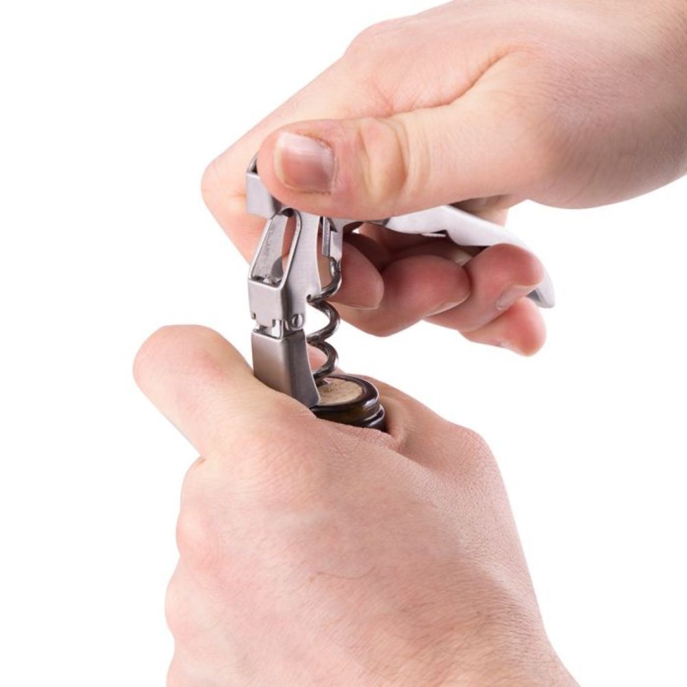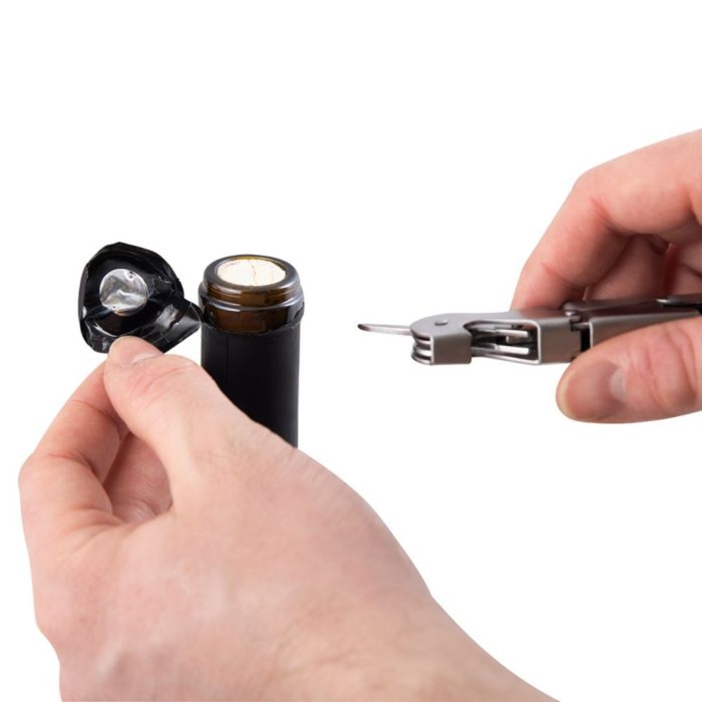 Provides a smart all-in-one tool for those who enjoy a glass of wine with their grilled food. With a corkscrew, two-step remover mechanism, foil cutter and bottle cap opener, it has everything you need.