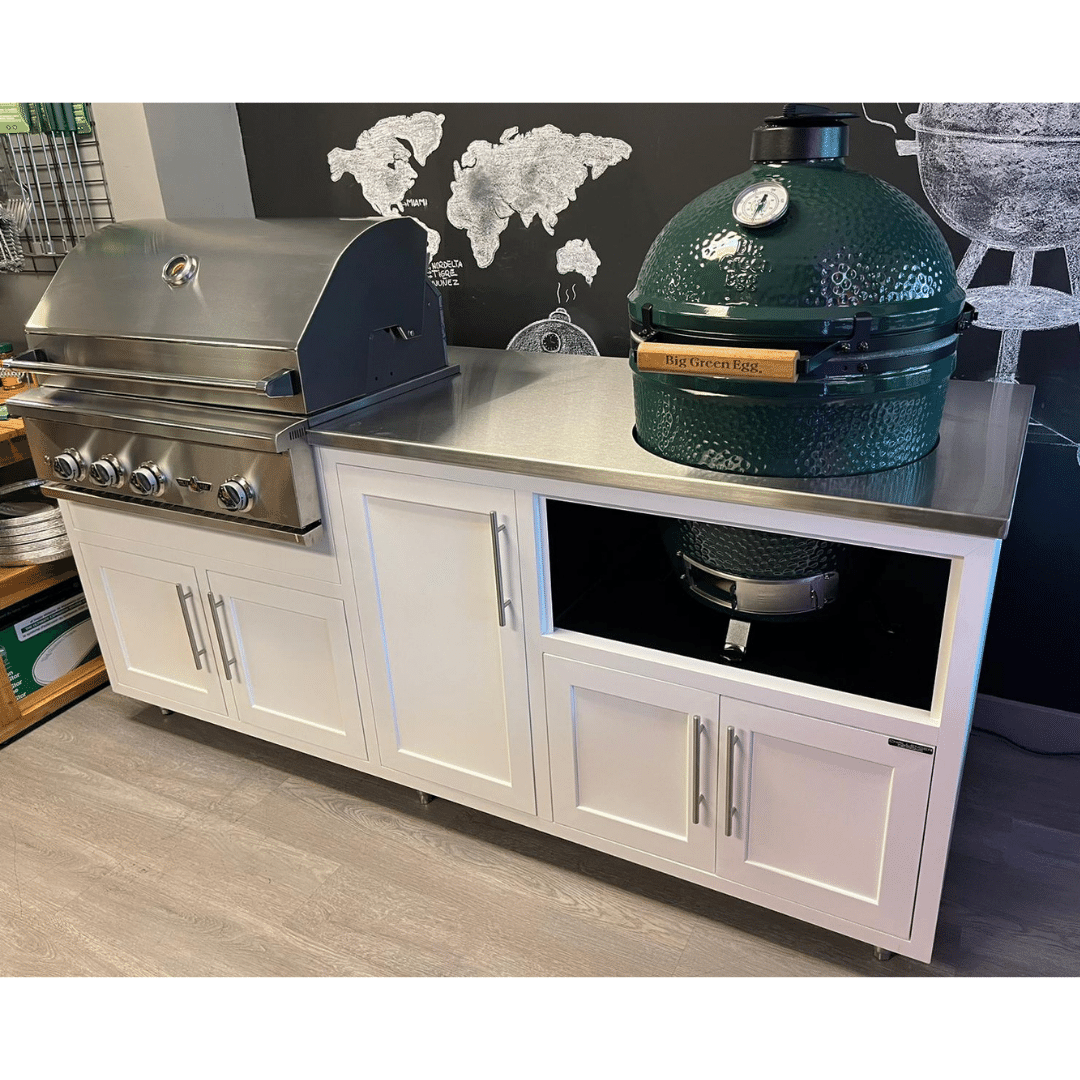 This absolutely Stunning White Shaker Challenger Designs Coastal Outdoor Kitchen comes with a Stainless Steel top.